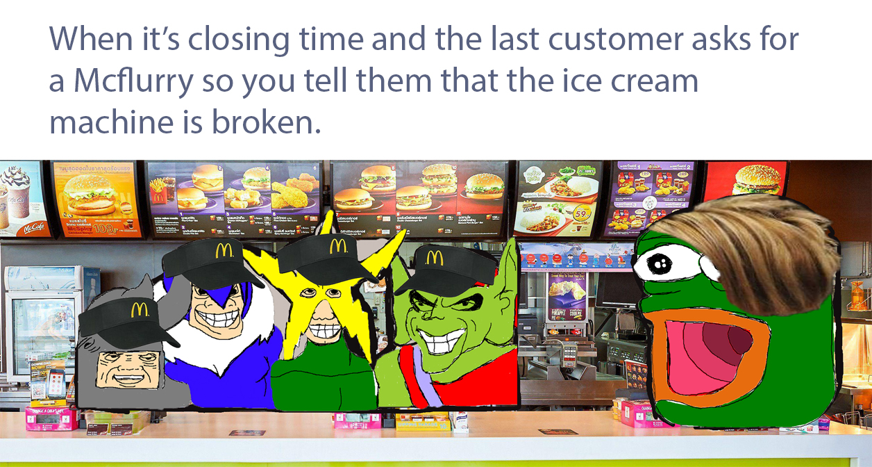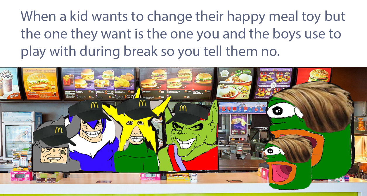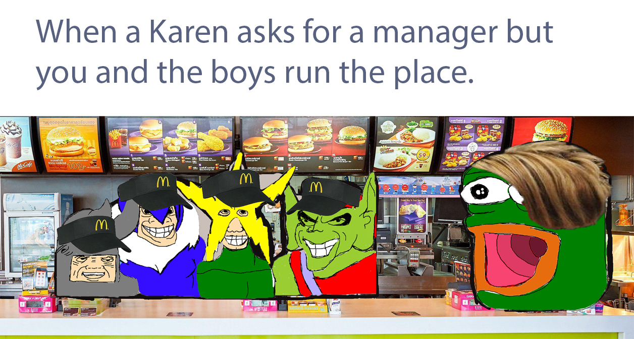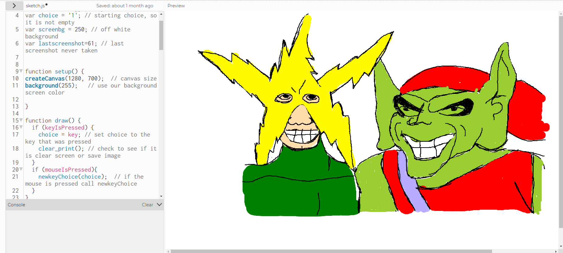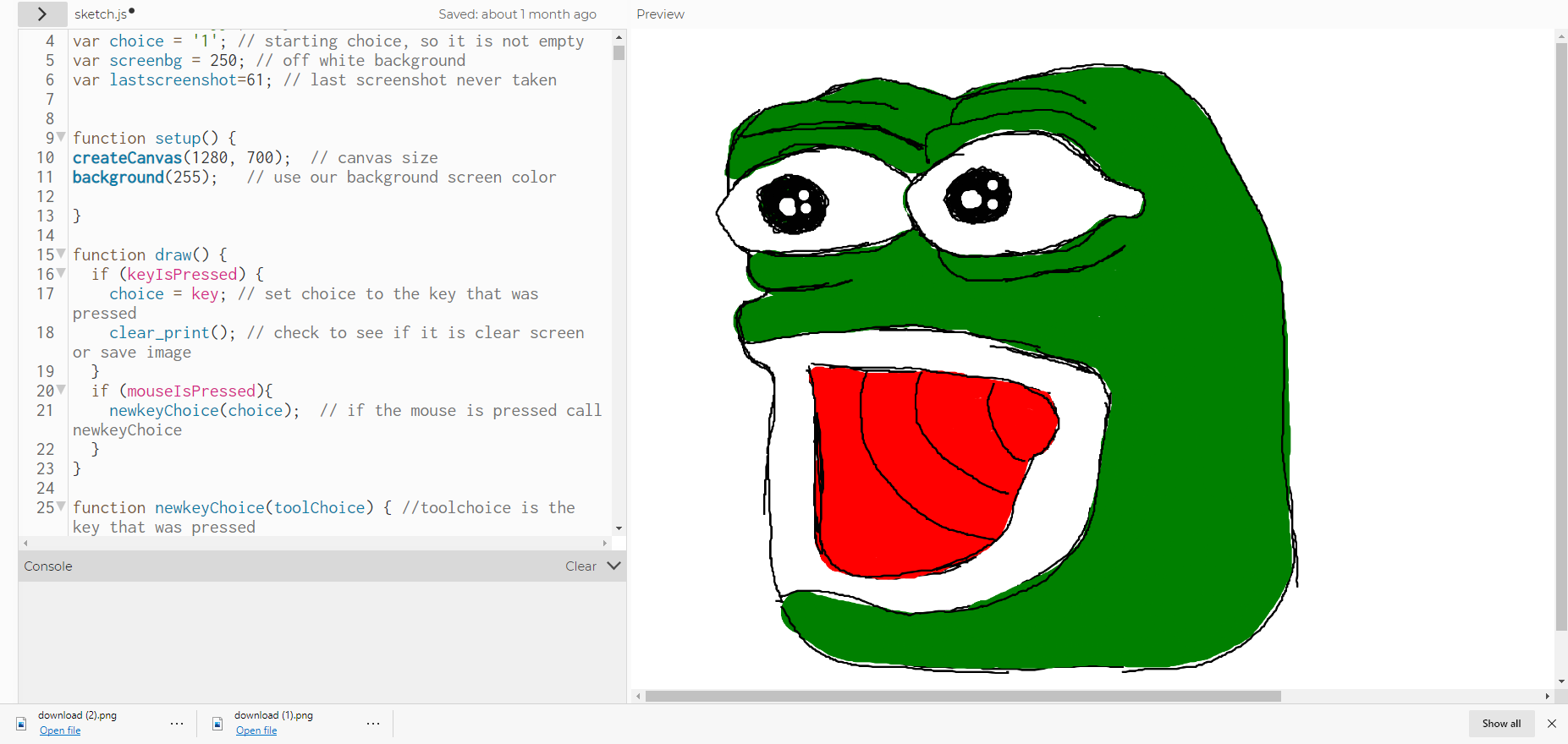Using P5JS.editor I went ahead and created some tools to create a couple drawings. I used a total of 14 tools to create the 3 different drawings, shown under, that were later combined using photoshop. While in photoshop I also went ahead and did a little touch up on the drawings with the tools that are available there. After the completion of the drawing I went on Google and got some images off of there in order to add more to the meme mashup that I wanted to created. The memes used for the project include; Me and the Boys, Poggers, and Karen.